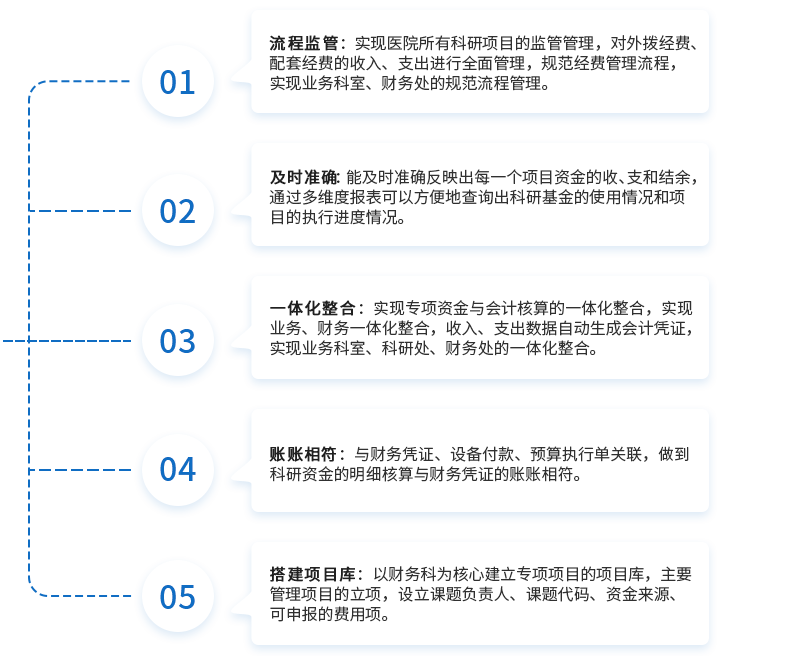 科研经费管理系统是专为医院专项资金科研项目的科学化管理而设计,实现医院所有科研项目的监管管理,贯穿医院所有科研项目立项、执行、中止、结项、结账全过程管理,对科研外拨经费、配套经费的收入、支出进行全面管理,规范经费管理流程,实现业务科室、科研处、财务处的规范流程管理,根据项目的经费余额进行报销总额控制,根据明细项目的设置进行精细化的费用控制,并实现与医院的会计核算系统进行有效的一体化业务整合,提高医院专项资金科研经费管理水平。